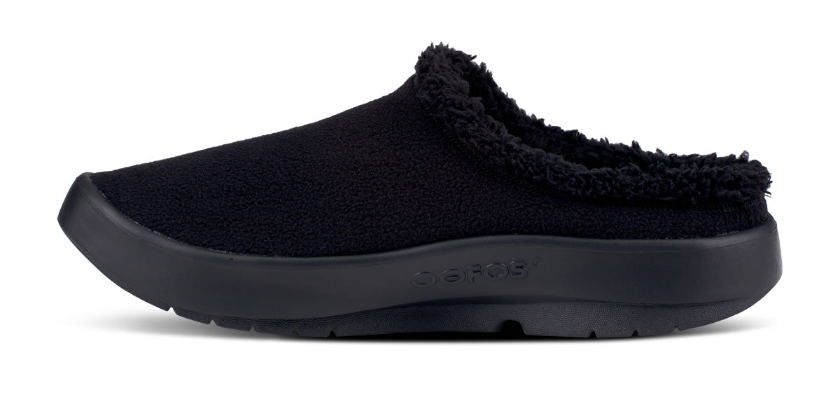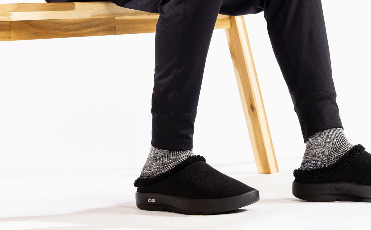 The OOcoozie Mule is the perfect around the house or post-gym option to slide into for stability and relief. Our unique one-of-a-kind OOfoam™ technology that absorbs impact is matched with a warm vegan sherpa material that is both recyclable and machine washable. Add in the unique footbed design that cradles and supports arches and you’ll recover faster. A versatile hygge style boasting active recovery – get cOOzy.